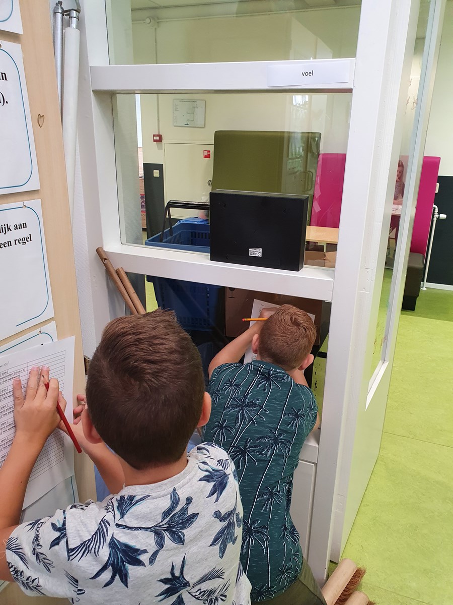 Gisteren hebben we dit met elkaar gedaan en vandaag hingen er overal werkwoorden door de school en de klas. De kinderen moesten de ik, hij en wij vorm opschrijven.